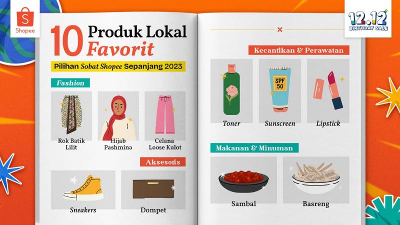 Melihat besarnya minat dan apresiasi masyarakat terhadap produk lokal, di momen spesial kampanye 12.12 Birthday Sale kali ini Shopee membagikan 10 Produk Lokal Favorit Pilihan Sobat Shopee Sepanjang Tahun 2023 mulai dari kategori fesyen, aksesoris, kecantikan, hingga makanan dan jajanan Nusantara: